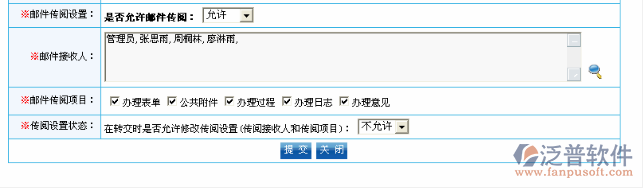 郵件傳閱設(shè)置【是否允許郵件傳閱】:如果選擇為“不允許”則此步驟辦理的內(nèi)容不通過(guò)內(nèi)部郵件的方式發(fā)送,“允許”則可以發(fā)送。