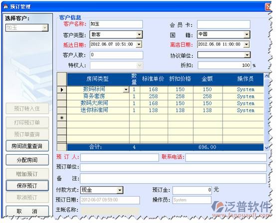 點擊OA工具欄上預定管理圖標,進入預定管理窗口,在填寫預訂單之前必須首先點擊增加預訂按鈕,然后輸入客戶名稱,預定抵達時間,客戶人數(shù),預訂人、聯(lián)系電話等。然后選擇房間類型,在彈出的窗口中可看到所有可用的房間類型及可用數(shù)量。對于有折扣的預訂房可在折扣價格一欄直接輸入房價,轉(zhuǎn)為入住后房間價格默認為該折扣價格。為了指定房間號,必須點擊”分配房間”按鈕,進入房間預分配窗口,然后選擇房間(只顯示在上一步選擇的房間級別,選擇房間號碼,根據(jù)上一步的房間數(shù)量選擇多個房間,然后點擊確定),回到上一窗口,點擊保存按鈕。