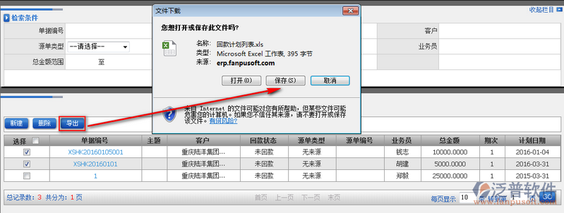 4、erp系統(tǒng)為用戶提供導(dǎo)出功能,用戶選中需要導(dǎo)出的回款信息,點(diǎn)擊【導(dǎo)出】便可。如圖: