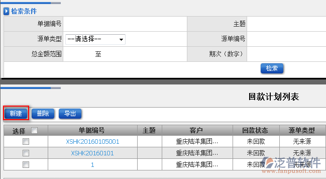 5、在查詢過程中,如果發(fā)現(xiàn)回款信息有遺漏的沒創(chuàng)建,用戶可以直接點(diǎn)擊【新建】進(jìn)入回款信息新增頁(yè)面。如圖: