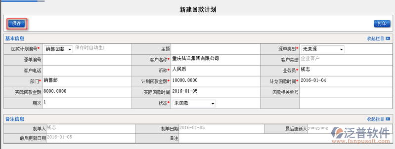 2、填寫完回款計劃中的相關(guān)信息,點擊【保存】便可完成新建回款計劃的創(chuàng)建。新建頁面中紅色標(biāo)示為必填選項。如圖: