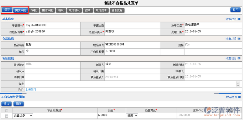 2、填寫完不合格品處置單中的相關(guān)信息,點(diǎn)擊【保存】后便可【提交審批】操作。如圖: