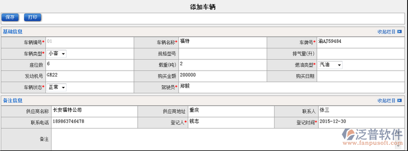 2、填寫(xiě)完車(chē)輛相關(guān)信息,點(diǎn)擊【保存】即可完成車(chē)輛基本信息的創(chuàng)建。如圖: