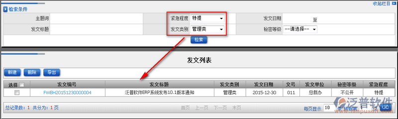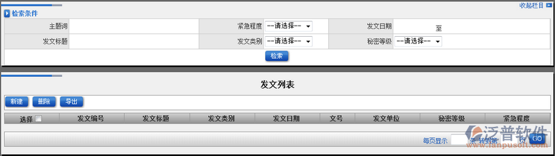 2、通過主界面的上半部分用戶可以進行模糊查詢檢索,檢索條件可以使多個條件或者單個條件進行模糊得到相應的發(fā)文信息。如圖: