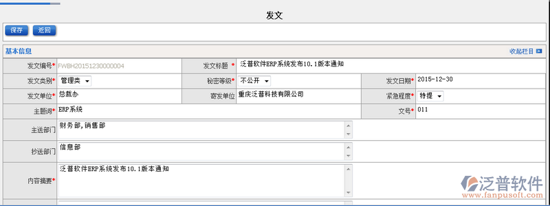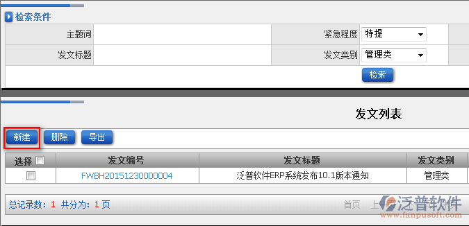 4、發(fā)文列表模塊關聯(lián)【新建發(fā)文】模塊,點擊【新建】即可進入發(fā)文的新增頁面。如圖: