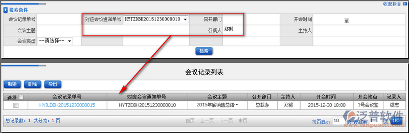 2、通過主界面中的檢索條件可以查詢出對應的會議記錄。檢索條件支持多個條件或者單個條件進行查詢。如圖: