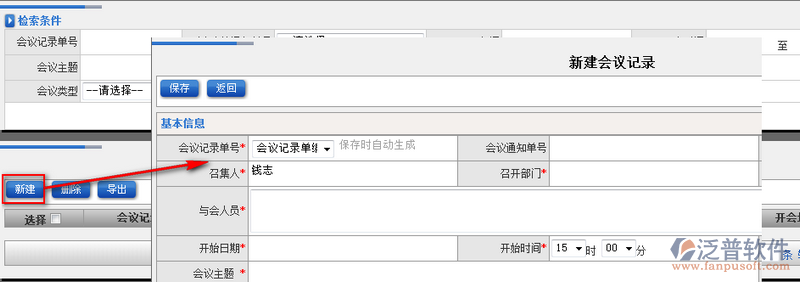 4、點擊左上角的【新建】即可進入會議記錄的新增頁面。如圖: