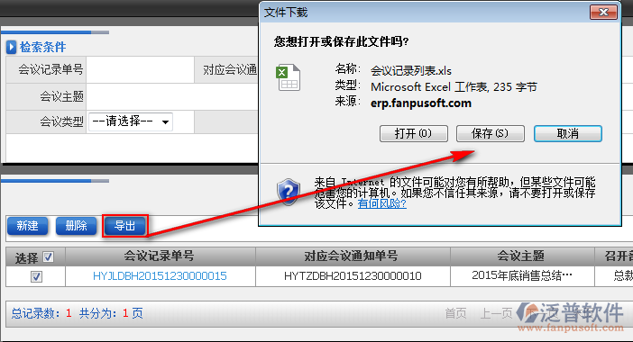 5、用戶在需要導出查看會議信息時,可以直接選中需要導出的會議信息點擊【導出】即可。如圖