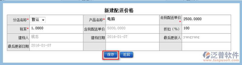 3、填寫完配送價格中的相關(guān)信息,點擊【保存】即可實現(xiàn)配送價格新增。如圖: