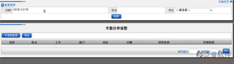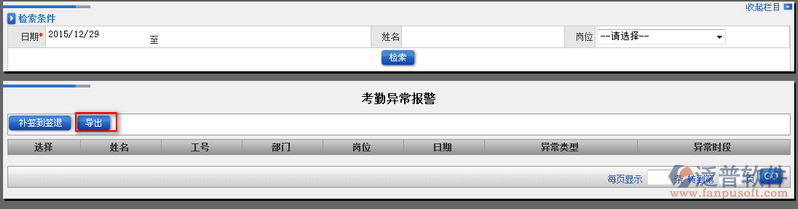 1、點(diǎn)擊【考勤異常報(bào)警】進(jìn)入考勤異常報(bào)警界面,在此界面的上半部分為檢索查詢部分,下半部分為異常顯示部分