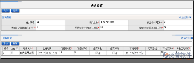 2、點(diǎn)擊【新建】進(jìn)入班次的新增頁(yè)面。填寫完相關(guān)信息點(diǎn)擊【保存】即可完成班次的創(chuàng)建。如圖: