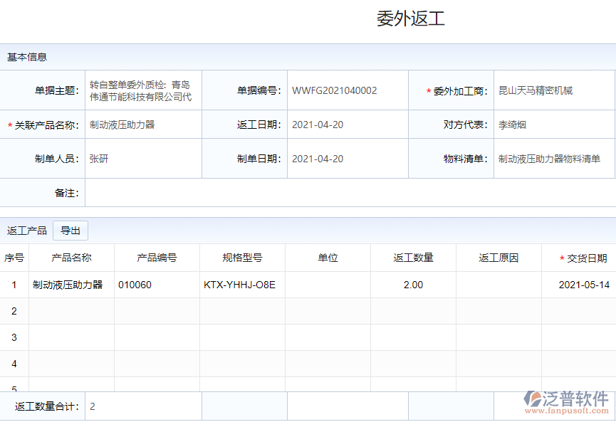 (1)通過泛普的委外返工單,可以實(shí)現(xiàn)將質(zhì)檢部和生產(chǎn)部/采購部直接關(guān)聯(lián)起來,在質(zhì)檢審核列表后面,有需要返工的就直接可以快速生成返工單,生產(chǎn)部這邊也可以聯(lián)查對應(yīng)的質(zhì)檢單,通過查看附件看出質(zhì)檢不合格的相關(guān)證明照片和資料。