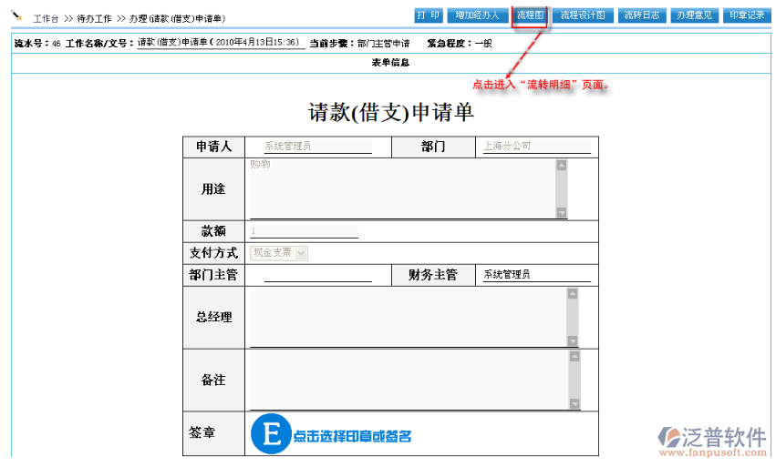 如果想查看此表單的什么時(shí)候建立的,誰做過說明樣的操作,都可以通過【流轉(zhuǎn)日志】,我們可以在表單辦理頁(yè)面的右上角點(diǎn)擊【