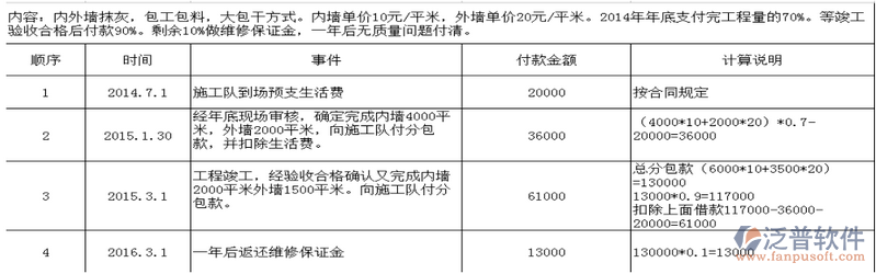 工程竣工,經(jīng)驗(yàn)收合格確認(rèn)又完成內(nèi)墻2000平米外墻1500平米。向施工隊(duì)付分包款。