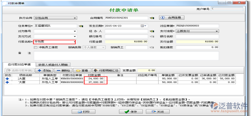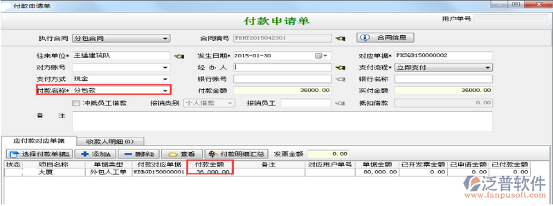 如有合同罰款可以在合同罰款出填寫(xiě)付款單。如下圖