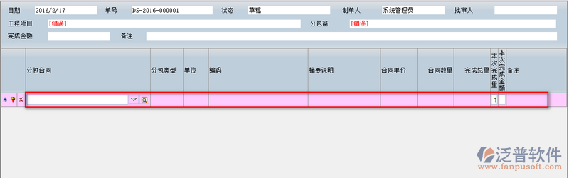 3、添加計量明細時選擇對應(yīng)的分包合同,填寫此次分包計量的完成量以及完成金額等相關(guān)信息。其中計量的直接責任者是各施工隊,施工隊長對計量資料負主要責任,隊部主任工程師對計量的數(shù)量和質(zhì)量負責,計量主體為項目部,主要負責人為項目經(jīng)理,項目部工程部對計量數(shù)量負責,項目部經(jīng)營部對單價的合理性和計量資料完整性、計算的合理性負責。質(zhì)檢部負責對工程質(zhì)量負責。如圖: