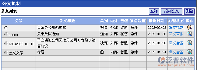 點(diǎn)擊[查詢]按鈕可按查詢條件(文號(hào)、標(biāo)題、主題詞、公文類(lèi)別、公文密級(jí)、緊急程度)顯示當(dāng)前操作員擬制過(guò)的公文信息。