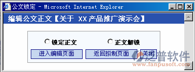 進(jìn)入編輯正文頁(yè)面之前,系統(tǒng)首先彈出此窗口,由用戶選擇編輯正文時(shí)是否要鎖定正文,如果選擇‘鎖定正文’,則當(dāng)前操作員在編輯該公文正文時(shí),該公文的其它相關(guān)辦理人員不能同時(shí)編輯(修改)該公文正文,而只能查看;如果選擇‘正文解鎖’,則當(dāng)前操作員在編輯該公文正文時(shí),該公文的其它相關(guān)辦理人員可以同時(shí)編輯(修改)該公文正文,該公文正文則以最后保存的內(nèi)容為準(zhǔn)。
