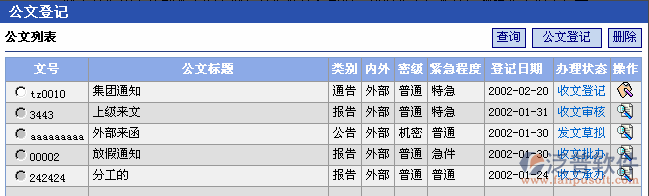 點(diǎn)擊[公文登記](méi)按鈕則進(jìn)入‘公文登記’頁(yè)面,如下圖: