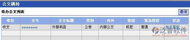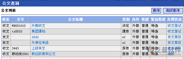 點(diǎn)擊[查詢]按鈕可按一般查詢條件(收發(fā)文、公文文號(hào)、公文文號(hào)、公文標(biāo)題、主題詞、公文類(lèi)別、公文密級(jí)、緊急程度)查詢顯示公文。