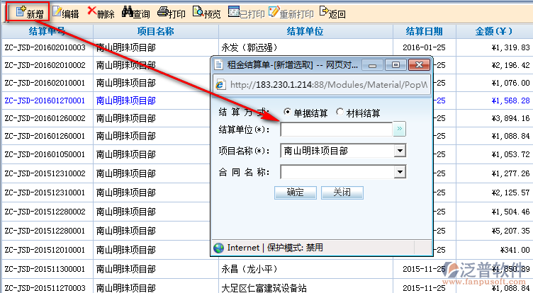 2、點(diǎn)擊主界面中的【新增】即可創(chuàng)建新的合同結(jié)算信息。如圖: