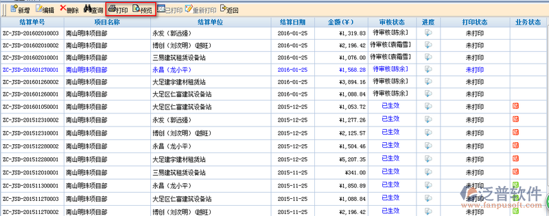 4、選中某一項(xiàng)結(jié)算信息,用戶可直接點(diǎn)擊【打印】出相關(guān)單據(jù)。如圖: