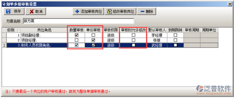 崗位角色以及用戶添加完成之后分別授權(quán)給相應(yīng)的用戶(數(shù)量或者單價(jià)),或設(shè)置審核時(shí)可修改,設(shè)置完成之后點(diǎn)擊“保存”的按鈕,審核方案設(shè)置完成之后則授權(quán)發(fā)起人(按人名或者按崗位),在授權(quán)用戶的復(fù)選框內(nèi)打勾即可,如果授權(quán)給“公共用戶”則在“公共用戶”的復(fù)選框內(nèi)打鉤,被授權(quán)的用戶可在創(chuàng)建單據(jù)的時(shí)候選擇多級(jí)審核方案,如圖: