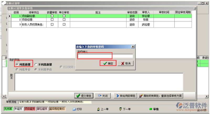 審核人審核時(shí),選擇“我的審核”的選項(xiàng),并輸入審核密碼,點(diǎn)擊“確定”按鈕,選擇下一位審核人,此時(shí)單據(jù)的審核狀態(tài)是“審核中”,如圖所示: