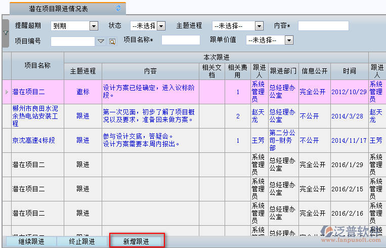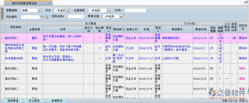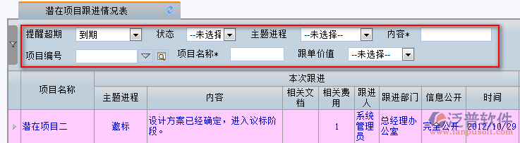 4、創(chuàng)建完整的項目跟進表可通過系統(tǒng)系統(tǒng)的檢索條件進行模糊查詢。同時檢索條件可為多個條件或者單個條件進行查詢。如圖: