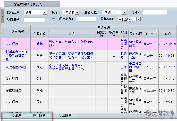2、在此頁面中可詳細(xì)查看到整個項目的跟進情況,同時可選擇是否繼續(xù)跟進或者終止跟進操作。如圖: