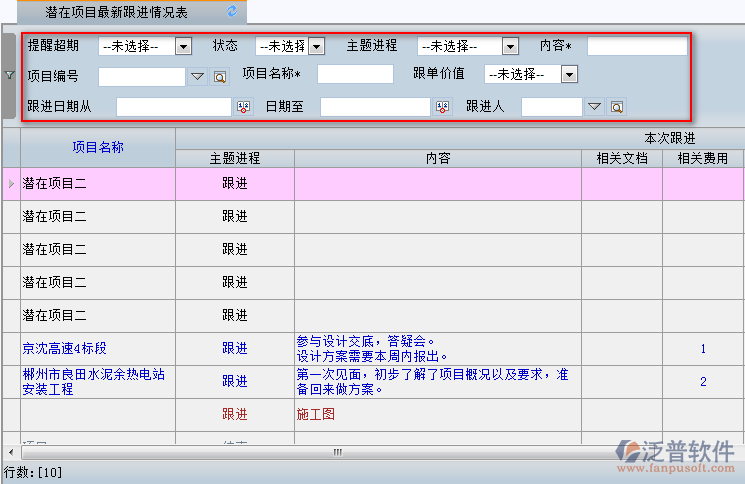 3、通過主界面中的檢索條件,用戶可快速查詢到相關(guān)的項目跟進信息。同時可多條件或單個條件進行檢索。如圖:
