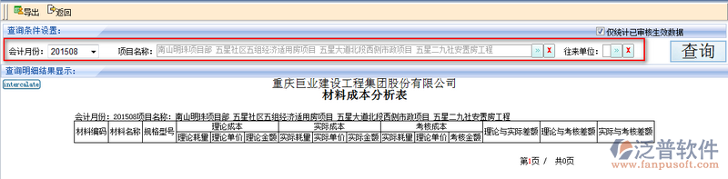 2、材料成本分析可通過系統(tǒng)系統(tǒng)的檢索條件進(jìn)行模糊查詢。系統(tǒng)支持多條件或單個條件進(jìn)行查詢。其中項(xiàng)目可以多個項(xiàng)目同時查詢。如圖: