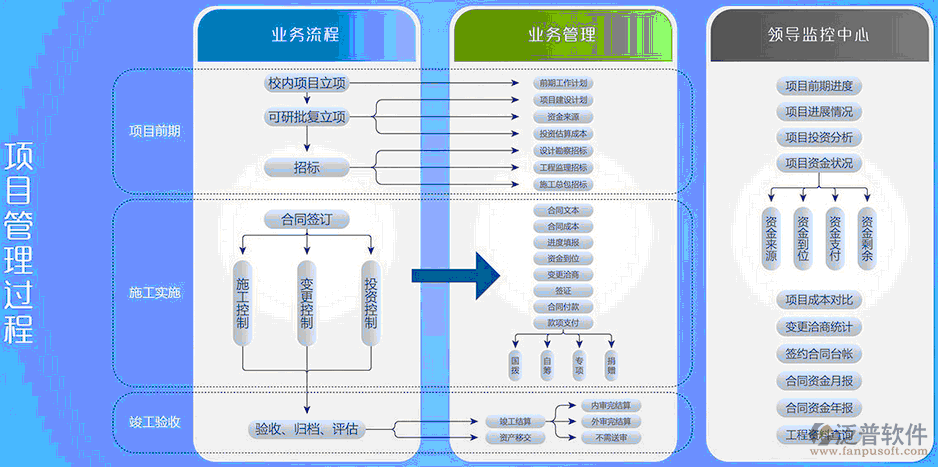 建設(shè)工程項目管理的內(nèi)容根據(jù)建設(shè)工程項目管理范圍的具體情況而定。泛普軟件從全面角度而言,項目管理服務(wù)可包括如下主要內(nèi)容:項目前期策劃、可行性研究、設(shè)計管理、投資管理、流程管理、合同管理、施工管理、工程變更管理、招投標(biāo)管理、采購管理等。