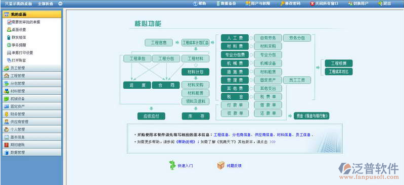 泛普軟件泛普OA系統(tǒng)建筑裝飾裝修管理軟件是一套專業(yè)的建筑施工管理軟件,單工程版面向只管理一個項目的用戶。該軟件包括工人管理、分包管理、機械設(shè)備租賃、材料管理、固定資產(chǎn)管理、財務(wù)管理、工程管理、供應(yīng)商管理和數(shù)據(jù)管理等主要模塊,內(nèi)含詳細而全面的統(tǒng)計信息,可以隨時提供人工支出統(tǒng)計、分包統(tǒng)計、機械設(shè)備租賃統(tǒng)計、固定資產(chǎn)使用統(tǒng)計、材料使用統(tǒng)計、供應(yīng)商統(tǒng)計、稅費支出統(tǒng)計、其他支出統(tǒng)計和工程核算等建筑施工企業(yè)非常關(guān)心的統(tǒng)計數(shù)據(jù)。該軟件界面簡單,操作方便,功能實用,非常適合建筑施工企業(yè)或項目經(jīng)理用于內(nèi)部管理。