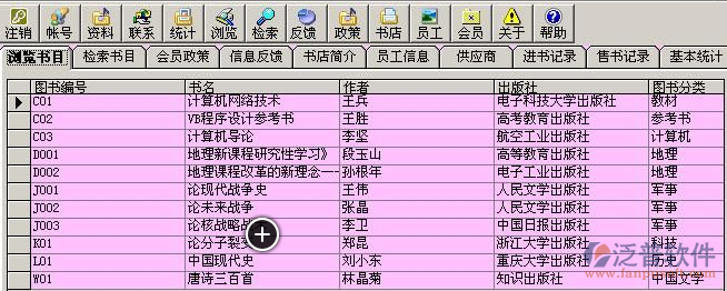 泛普軟件圖書管理系統(tǒng)采用多文檔窗體,ADO編程,使用了最新的數(shù)據(jù)庫引擎確保您的數(shù)據(jù)安全可靠。圖書管理系統(tǒng)/圖書軟件/圖書管理軟件/圖書銷售軟件/圖書館信息管理系統(tǒng)/圖書館信息管理軟件。可以用于校園企事業(yè)單位機(jī)關(guān)部門的通用圖書管理系統(tǒng),泛普圖書館管理系統(tǒng)是國內(nèi)外圖書館應(yīng)用最廣泛的圖書管理系統(tǒng)。支持條碼搶,磁卡會員管理,小票打印機(jī)及相關(guān)門禁設(shè)備。是管理單位,校園圖書館的最佳助手。泛普圖書館管理系統(tǒng)是本公司精心打造的產(chǎn)品,是經(jīng)過全國千百家企事業(yè)單位大專院校及政府部門實際使用的優(yōu)秀產(chǎn)品,本軟件功能強(qiáng)大的同時操作卻很容易,輕松。圖書館管理人員會很方便的使用本軟件,是圖書館管理人員的最佳助手。泛普ThinKOne系統(tǒng)的圖書管理軟件現(xiàn)有單機(jī)版,CS網(wǎng)絡(luò)版和BS網(wǎng)絡(luò)版三種可配合使用。