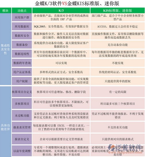很多人買軟件,只會說買財務軟件、進銷存軟件……其實金蝶的軟件品種繁多,大體分為EAS、K/3、KIS三大系列,EAS不是普通企業(yè)用得起的,所以財務用的最多的就是K/3和金蝶KIS系列的。K/3系列有WISE版和RISE版,KIS系列有專業(yè)版、標準版、迷你版等等……這里就介紹下K/3和金蝶KIS標準版、迷你版的區(qū)別。下圖所示: