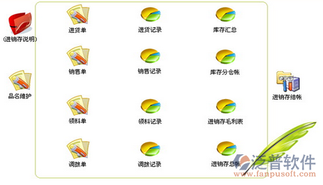 泛普軟件進(jìn)銷存軟件主要分為采購(gòu)管理,銷售管理,倉(cāng)庫(kù)管理,財(cái)務(wù)管理,經(jīng)營(yíng)分析,系統(tǒng)設(shè)置(權(quán)限管理)六大部分主要功能包括: