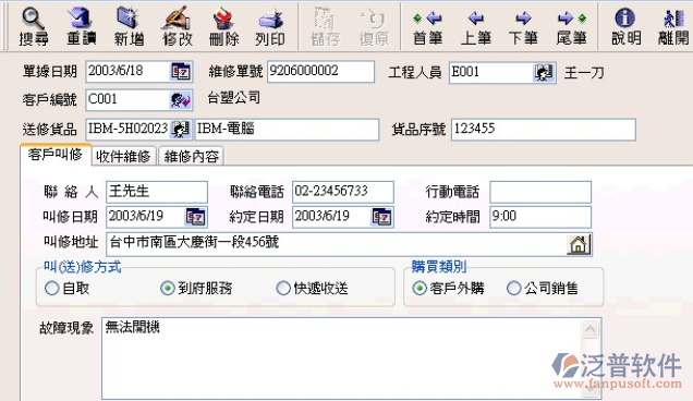 售后服務(wù)管理軟件根據(jù)來電馬上得到客戶的詳細(xì)資料,購買意向,銷售記錄,售后服務(wù)記錄,投訴/建議記錄,回訪記錄,迅速完成客戶的報修,更好的為客戶服務(wù)。泛普軟件的售后管理系統(tǒng)功能強(qiáng)大的處理流程和統(tǒng)計報表會成為各類售后服務(wù)企業(yè)的好幫手。本軟件可用于售后服務(wù)企業(yè)的呼叫中心軟件來使用,操作和使用上都比較容易上手。